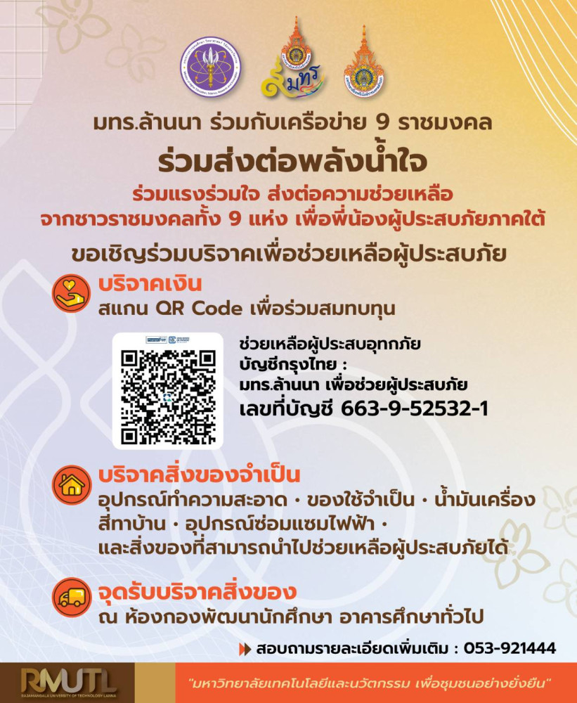 มหาวิทยาลัยเทคโนโลยีราชมงคลล้านนา ขอเชิญชวนบุคลากร นักศึกษา ศิษย์เก่า และประชาชนทั่วไป ร่วมส่งต่อพลังน้ำใจเพื่อช่วยเหลือผู้ประสบภัยในพื้นที่ประสบอุทกภัยภาคใต้ ผ่านการระดมทุนและรับบริจาคสิ่งของจำเป็น ภายใต้ความร่วมมือของ “เครือข่าย 9 ราชมงคล” เพื่อบรรเทาความเดือดร้อนและสนับสนุนการฟื้นฟูความเป็นอยู่ของพี่น้องประชาชนที่ได้รับผลกระทบจากอุทกภัยในพื้นที่ภาคใต้โดยสามารถร่วมกิจกรรม
