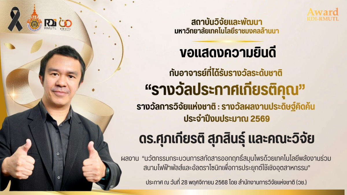 สถาบันวิจัยและพัฒนา มหาวิทยาลัยเทคโนโลยีราชมงคลล้านนา ขอแสดงความยินดีแก่คณาจารย์ นักวิจัย และทีมวิจัย มทร.ล้านนา ที่ได้รับ รางวัลการวิจัยแห่งชาติ : รางวัลผลงานประดิษฐ์คิดค้น ประจำปีงบประมาณ 2569 จากสำนักงานการวิจัยแห่งชาติ (วช.) ซึ่งเป็นรางวัลสำคัญระดับประเทศที่มอบให้แก่ผลงานประดิษฐ์คิดค้นที่มีศักยภาพในการนำไปใช้ประโยชน์เชิงเศรษฐกิจและสังคมของประเทศ