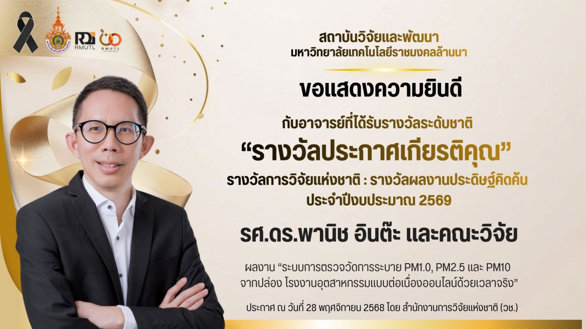 สถาบันวิจัยและพัฒนา มหาวิทยาลัยเทคโนโลยีราชมงคลล้านนา ขอแสดงความยินดีแก่คณาจารย์ นักวิจัย และทีมวิจัย มทร.ล้านนา ที่ได้รับ รางวัลการวิจัยแห่งชาติ : รางวัลผลงานประดิษฐ์คิดค้น ประจำปีงบประมาณ 2569 จากสำนักงานการวิจัยแห่งชาติ (วช.) ซึ่งเป็นรางวัลสำคัญระดับประเทศที่มอบให้แก่ผลงานประดิษฐ์คิดค้นที่มีศักยภาพในการนำไปใช้ประโยชน์เชิงเศรษฐกิจและสังคมของประเทศ