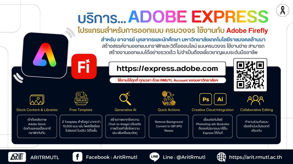 ข่าวประชาสัมพันธ์ สวส.มทร.ล้านนา : ADOBE EXPRESS โปรแกรมสำหรับการออกแบบ ครบวงจร ใช้งานกับ Adobe Firefly สำหรับ อาจารย์ บุคลากรและนักศึกษา มทร.ล้านนา เพื่อการเรียน การสอน และการวิจัย