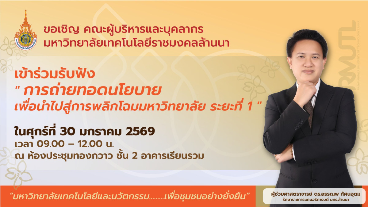 มหาวิทยาลัยเทคโนโลยีราชมงคลล้านนา เชียงใหม่ ขอเชิญคณาจารย์ เจ้าหน้าที่ และนักศึกษา เข้าร่วมกิจกรรมรับฟังการถ่ายทอดนโยบายเพื่อนำไปสู่การพลิกโฉมมหาวิทยาลัย ระยะที่ 1 ซึ่งจะจัดขึ้นในศุกร์ที่ 30 มกราคม 2569 เวลา 09.00 – 12.00 น. ณ ห้องประชุมทองกวาว ชั้น 2 อาคารเรียนรวม