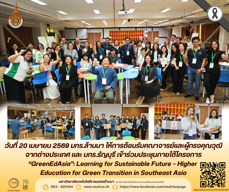 วันที่ 20 เมษายน 2569 รองศาสตราจารย์ ดร.ประชา ยืนยงกุล รองอธิการบดีฝ่ายวิชาการและกิจการนักศึกษา กล่าวต้อนรับ คณาจารย์และผู้ทรงคุณวุฒิจาก Häme University of Applied Sciences (ประเทศฟินแลนด์), University of Burgos (ประเทศสเปน), Ho Chi Minh City University of Technology and Education (ประเทศเวียดนาม), Dong Thap University (ประเทศเวียดนาม) และ มหาวิทยาลัยเทคโนโลยีราชมงคลธัญบุรี (ประเทศไทย) ในโอกาสที่เดินทางเข้าร่วมการประชุมเชิงปฏิบัติการ ณ ห้อง innovation ชั้น 6 อาคารเฉลิมพระเกียรติ มหาวิทยาลัยเทคโนโลยีราชมงคลล้านนา (RMUTL) เชียงใหม่ ภายใต้โครงการยุโรป “Learning for Sustainable Future – Higher Education for Green Transition in Southeast Asia” (GreenEdAsia) โครงการ GreenEdAsia ภายใต้กรอบ ERASMUS+ และได้รับการสนับสนุนงบประมาณจากสหภาพยุโรป จำนวนรวมทั้งสิ้น 800,000 ยูโร เพื่อส่งเสริมการพัฒนาที่ยั่งยืนในภูมิภาคเอเชียตะวันออกเฉียงใต้ผ่านการศึกษาในระดับอุดมศึกษา โดยมุ่งเน้นการบูรณาการแนวคิดด้านสิ่งแวดล้อมและความเป็นมิตรต่อสิ่งแวดล้อมเข้าสู่หลักสูตรและกระบวนการจัดการเรียนการสอน